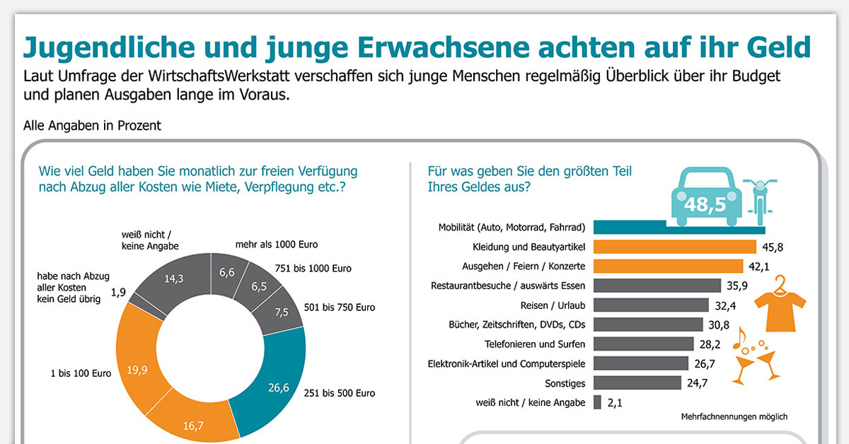 In unserer Infografik seht Ihr, wie viel Geld andere Jugendliche im Schnitt zur Verfügung haben, wofür sie es ausgeben – und wer ihre Kaufentscheidungen am meisten beeinflusst.